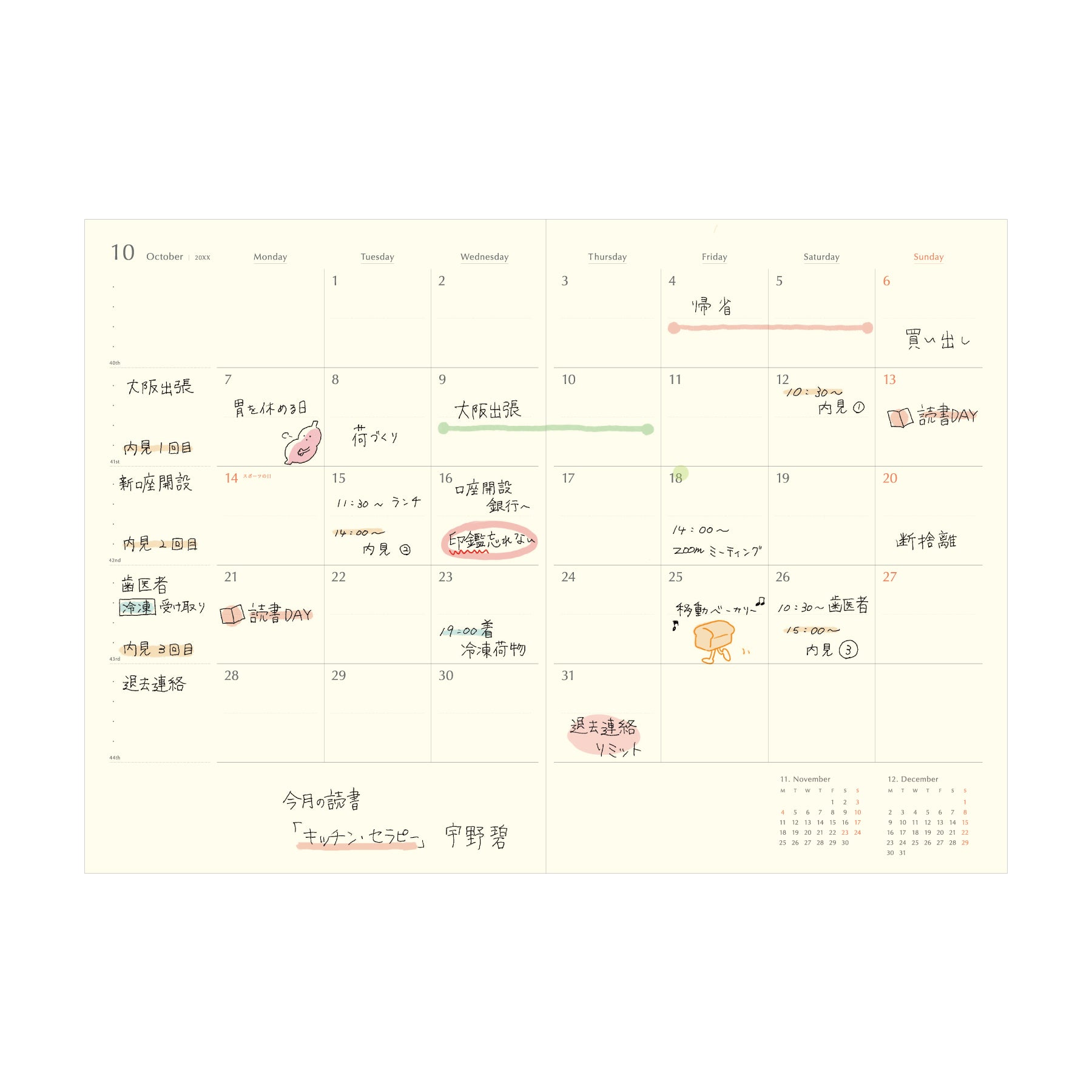 - A5 size for extensive writing, suitable for those who want to manage their plans monthly. Horizontal ruling in the monthly squares allows differentiation for morning/evening and work/private use.