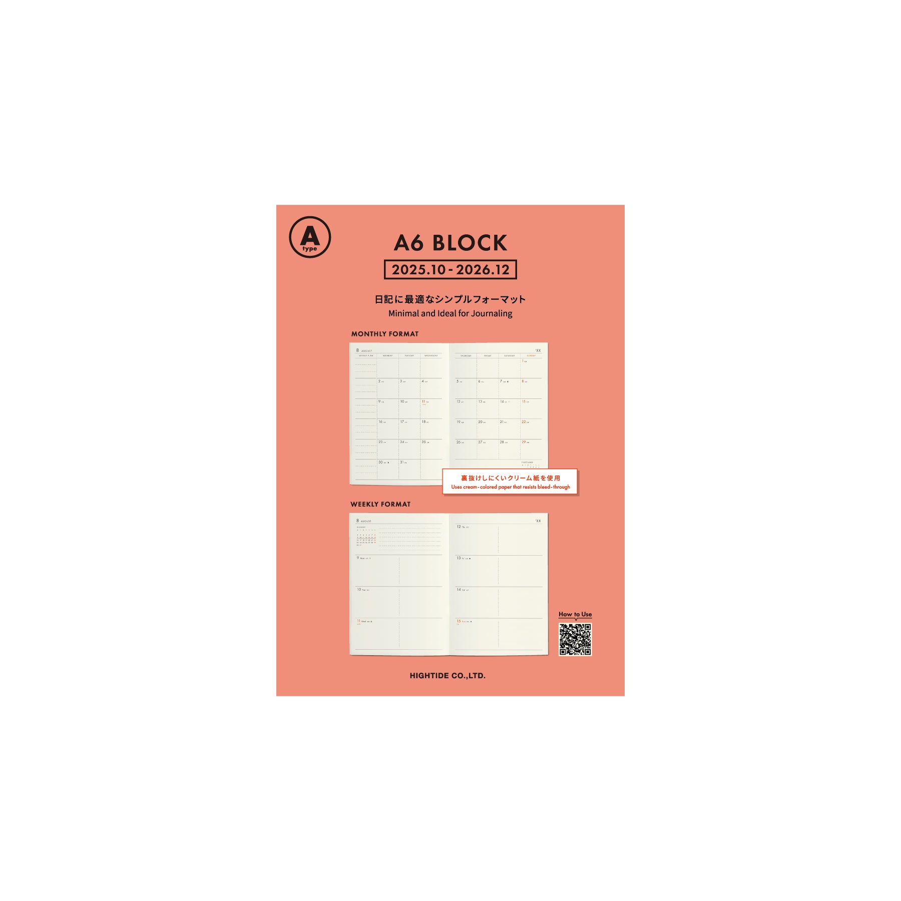An A6 Block planner refill for 2026 containing both monthly/weekly sections by Hightide. Upgraded from the 25N planner to PasPier Cream paper to resist bleeding from fountain pens and markers. The simple, easy-to-read one-week layout with wide daily spaces makes it practical to use as a diary.