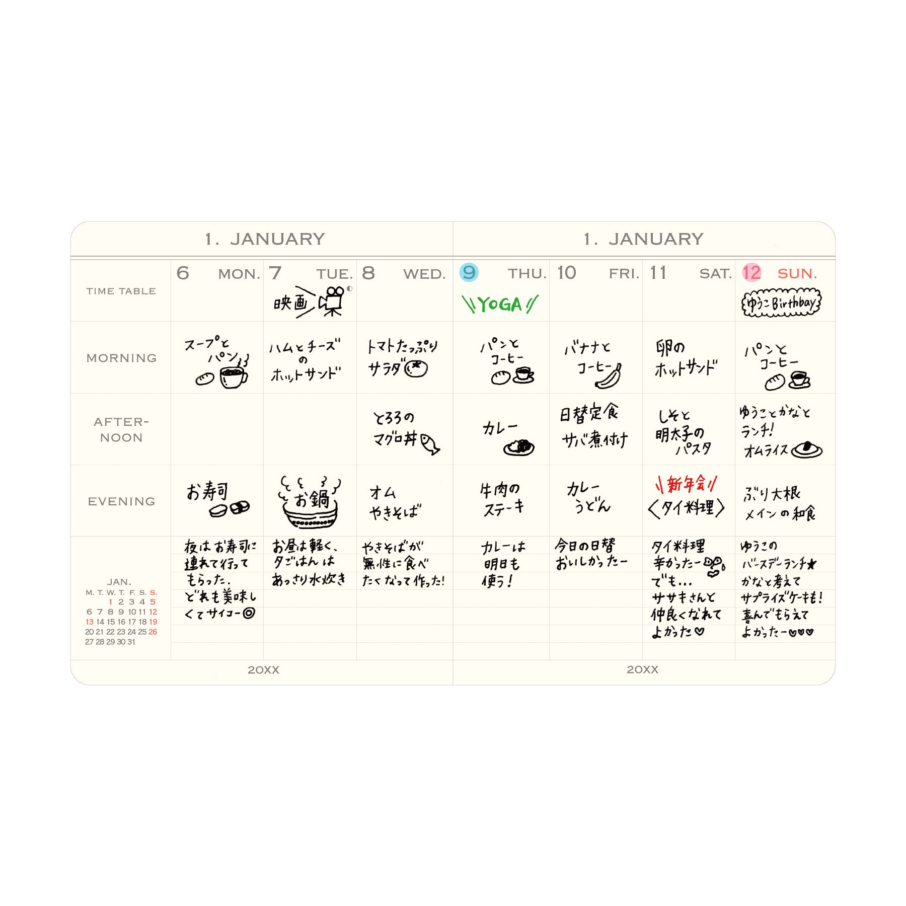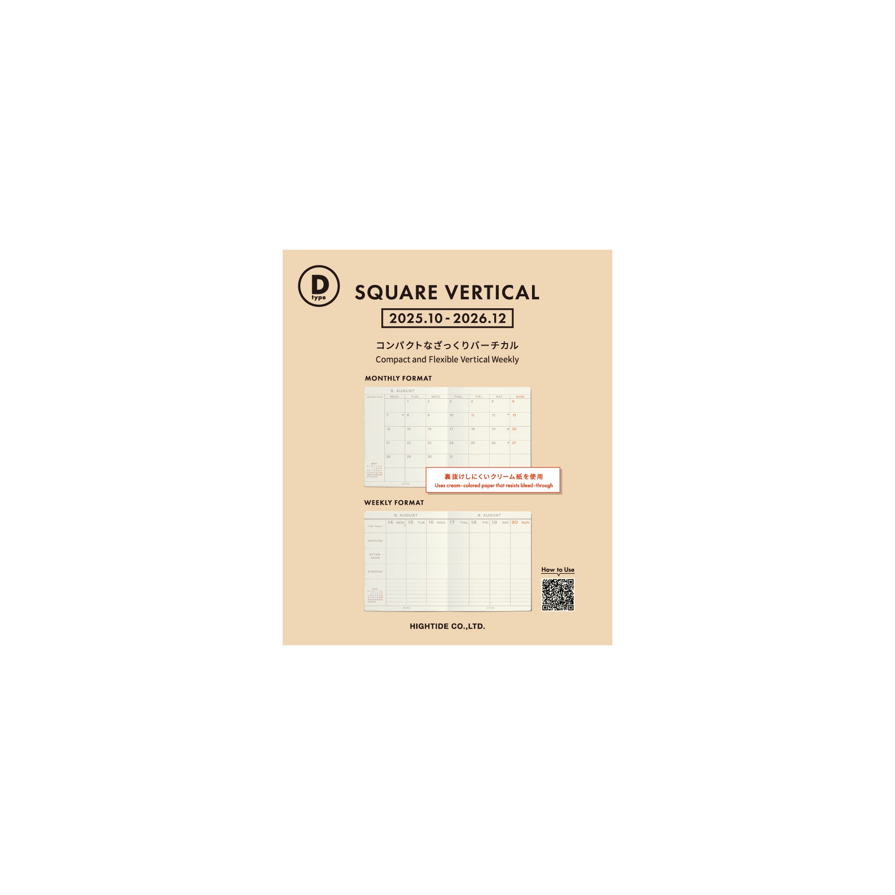 A square planner refill for 2026 containing both monthly/weekly sections by Hightide. Upgraded from the 25N planner to PasPier Cream paper to resist bleeding from fountain pens and markers.