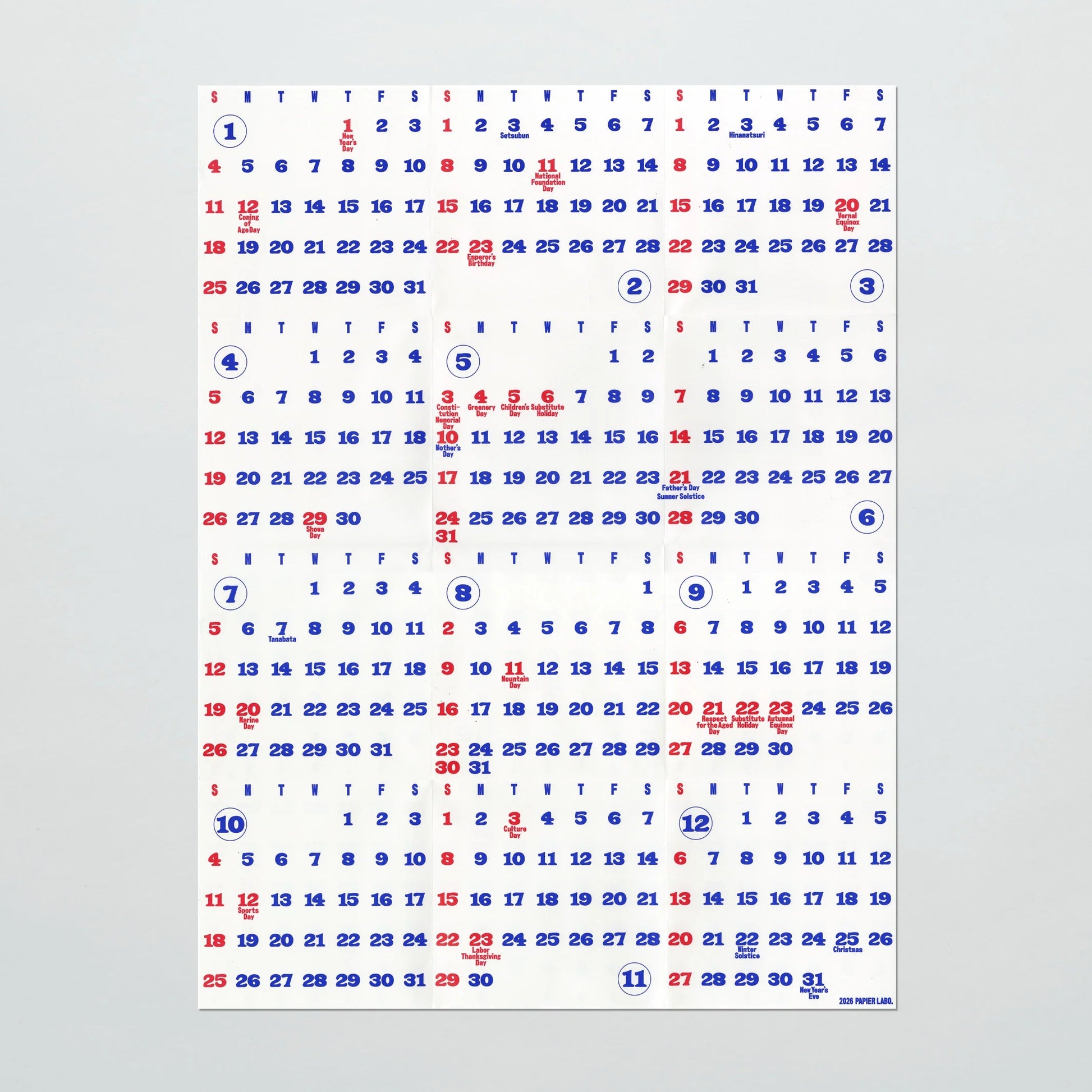 It's designed to view the whole year easily & all at once with contrasty blue and red types. The days that are not holidays but you want to remember are marked in fluorescent yellow and written down in fluorescent orange. (FYI the holidays are Japanese national holidays.)