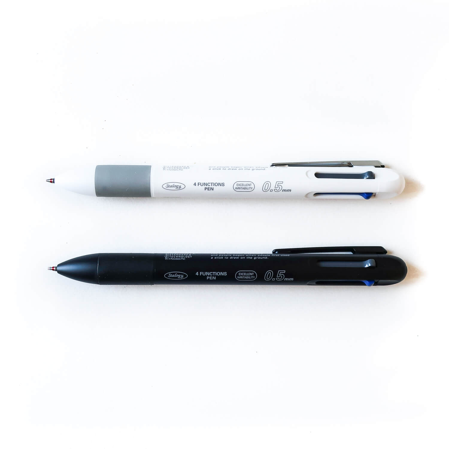 A 4 way use pen with red, blue and black ballpoints, and a mechanical pencil function from Stalogy, Japan. Refill sold separately.