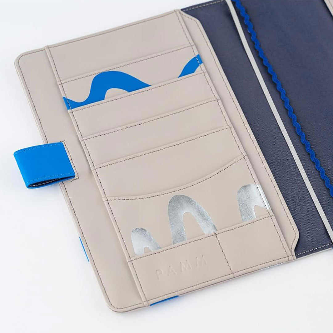 - The “butterfly-stopper” pen holder loops act as a hinge, keeping the cover safely shut while you store a pen inside. They are colored in blue and silver for this planner cover.