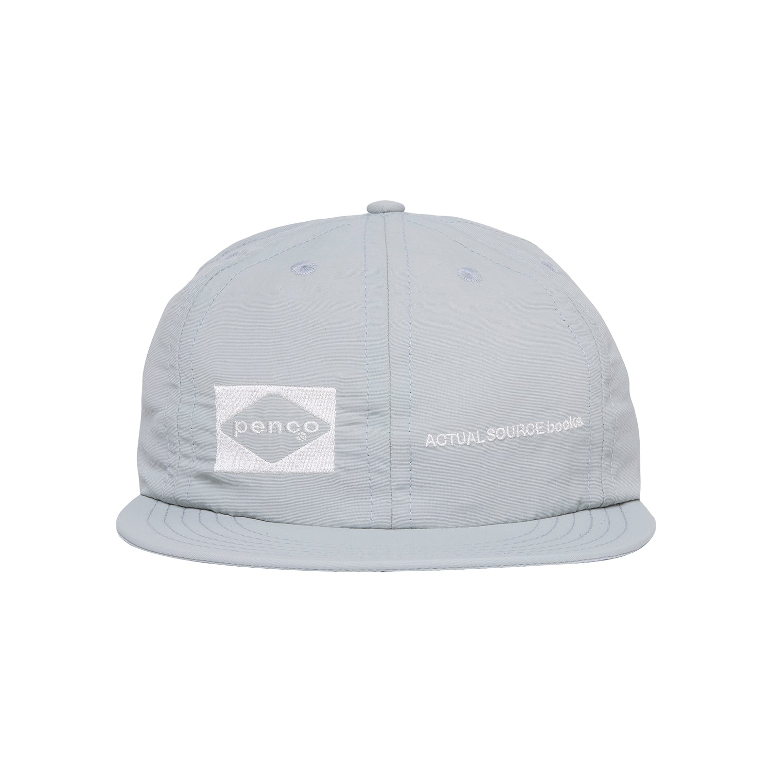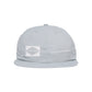 Made of gray nylon fabric with white embroidery thread. The back features a nylon webbing strap with an adjustable buckle.