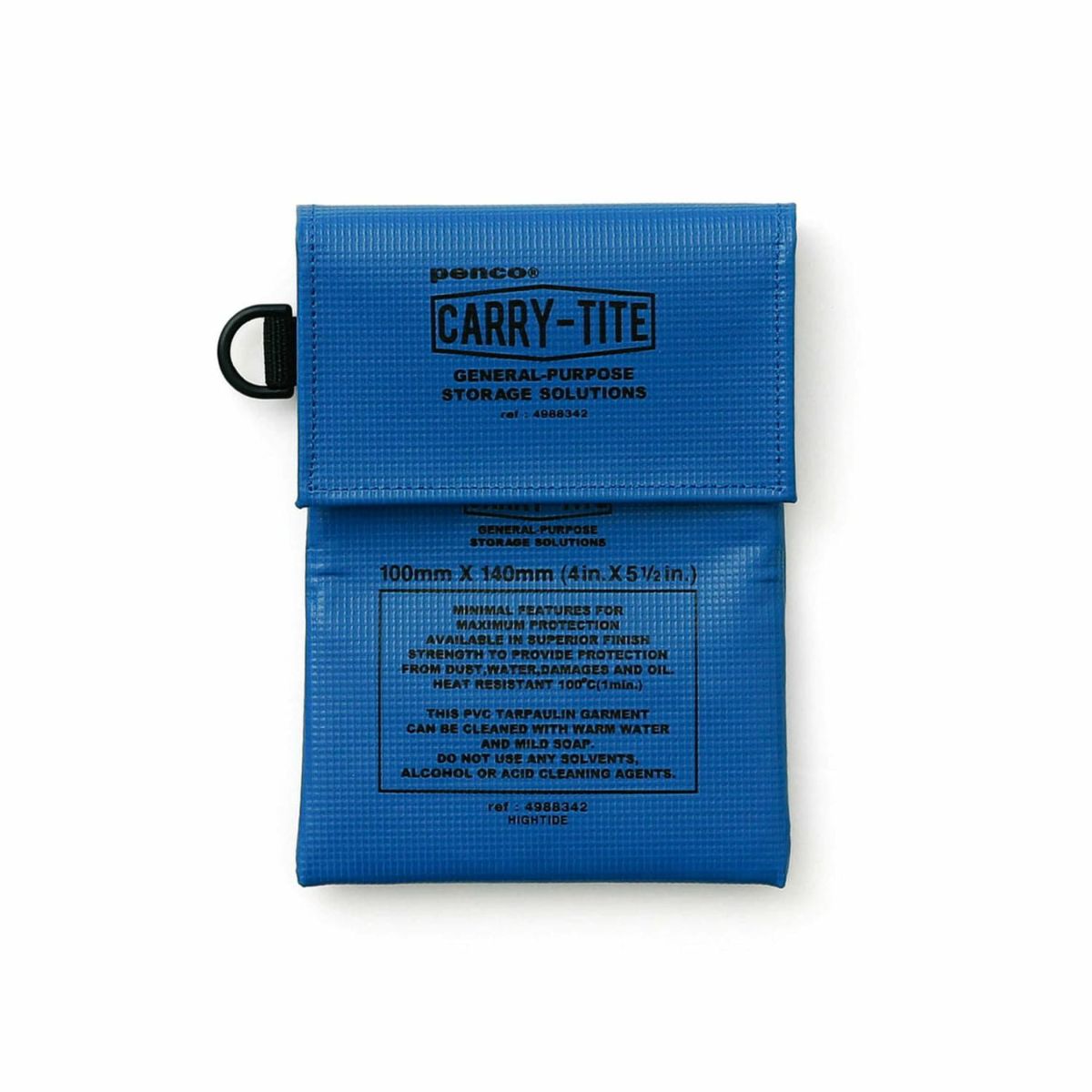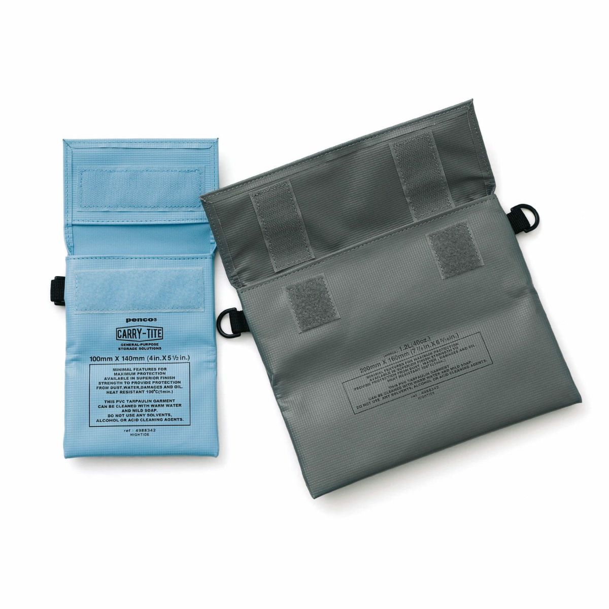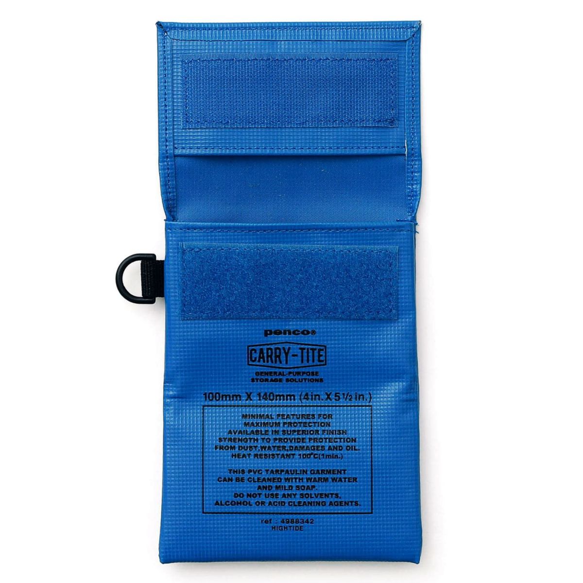 A small, 2-way versatile general purpose case made of PVC tarpaulin with matching color velcro closures by penco. This updated version comes with a D shaped ring you can attach a strap so you can use it as a neck strap or a sacoche bag through a cord or a phone shoulder/neck strap, etc., sold separately.