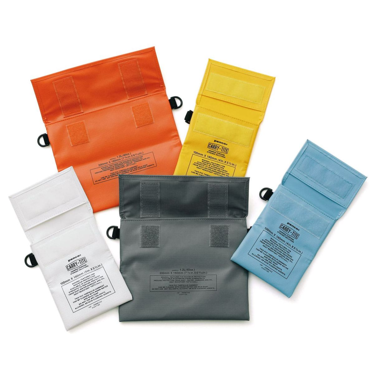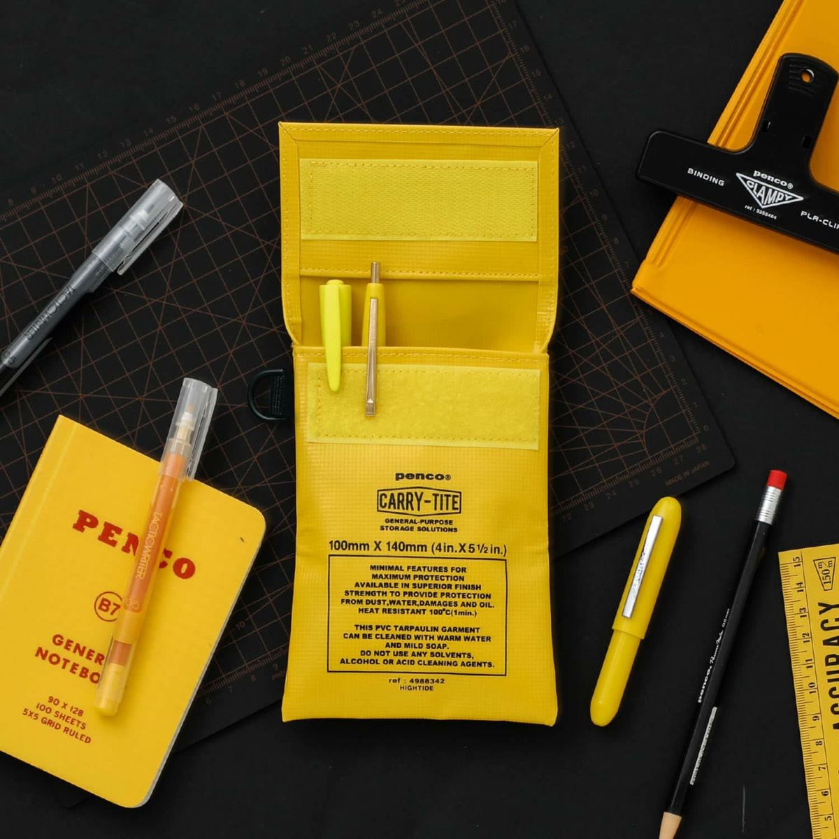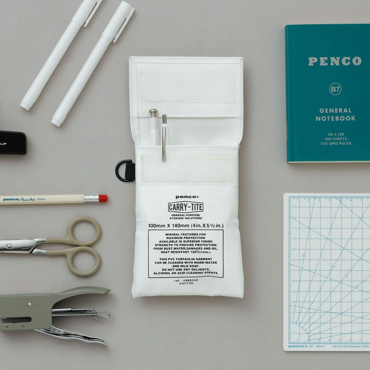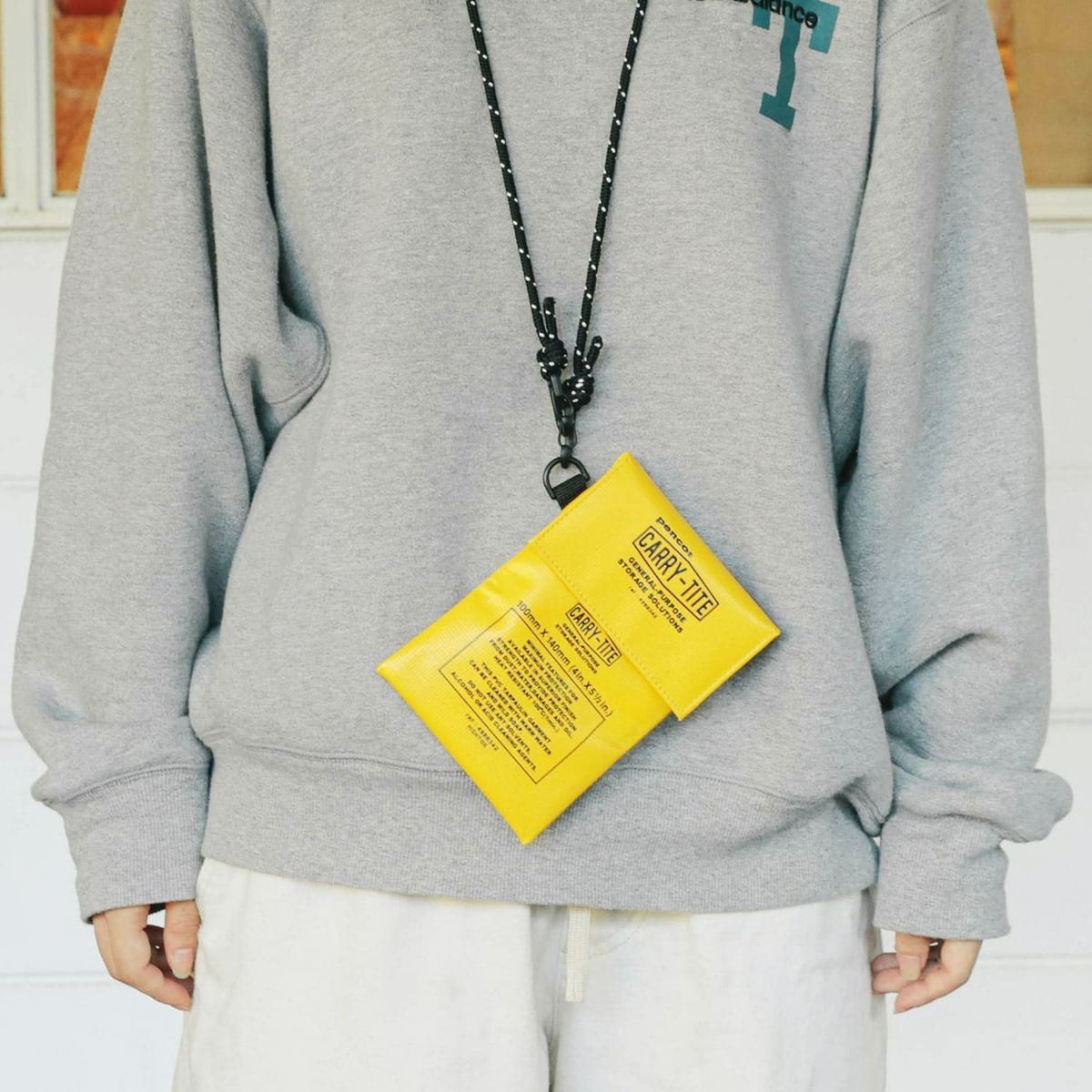 A small, 2-way versatile general purpose case made of PVC tarpaulin with matching color velcro closures by penco. This updated version comes with a D shaped ring you can attach a strap so you can use it as a neck strap or a sacoche bag through a cord or a phone shoulder/neck strap, etc., sold separately.