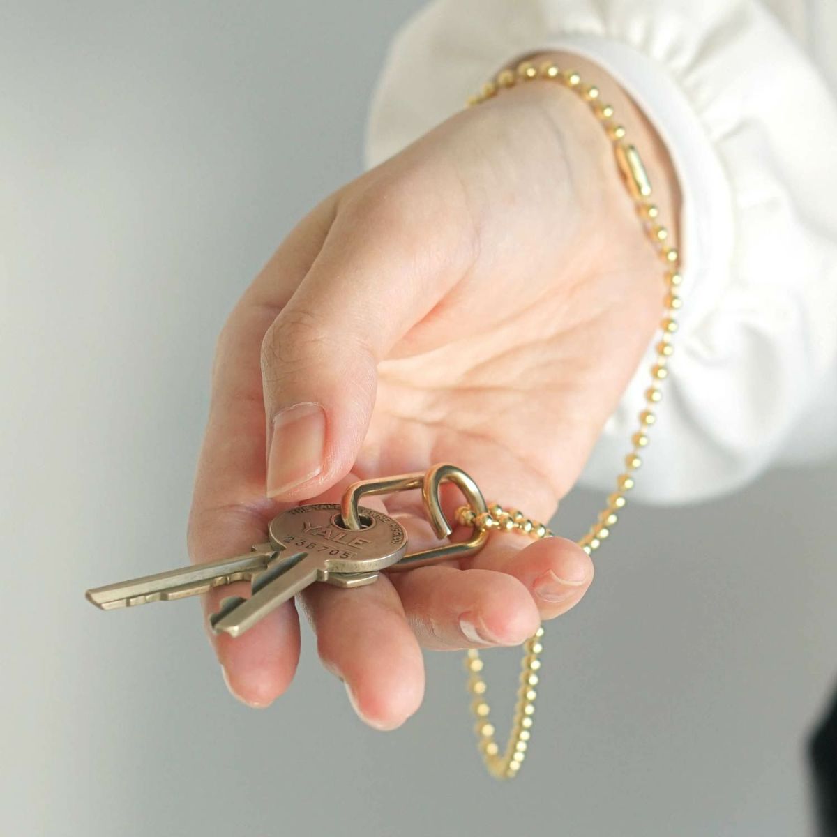 This is a simple key ring in the shape of a paper clip with a ball chain. The brass becomes darker with more characters as it is used longer. The included ball chain is 42 cm / 16.5 inches long, so you can cut it to any length you like. It comes in a box and is a gift ready.