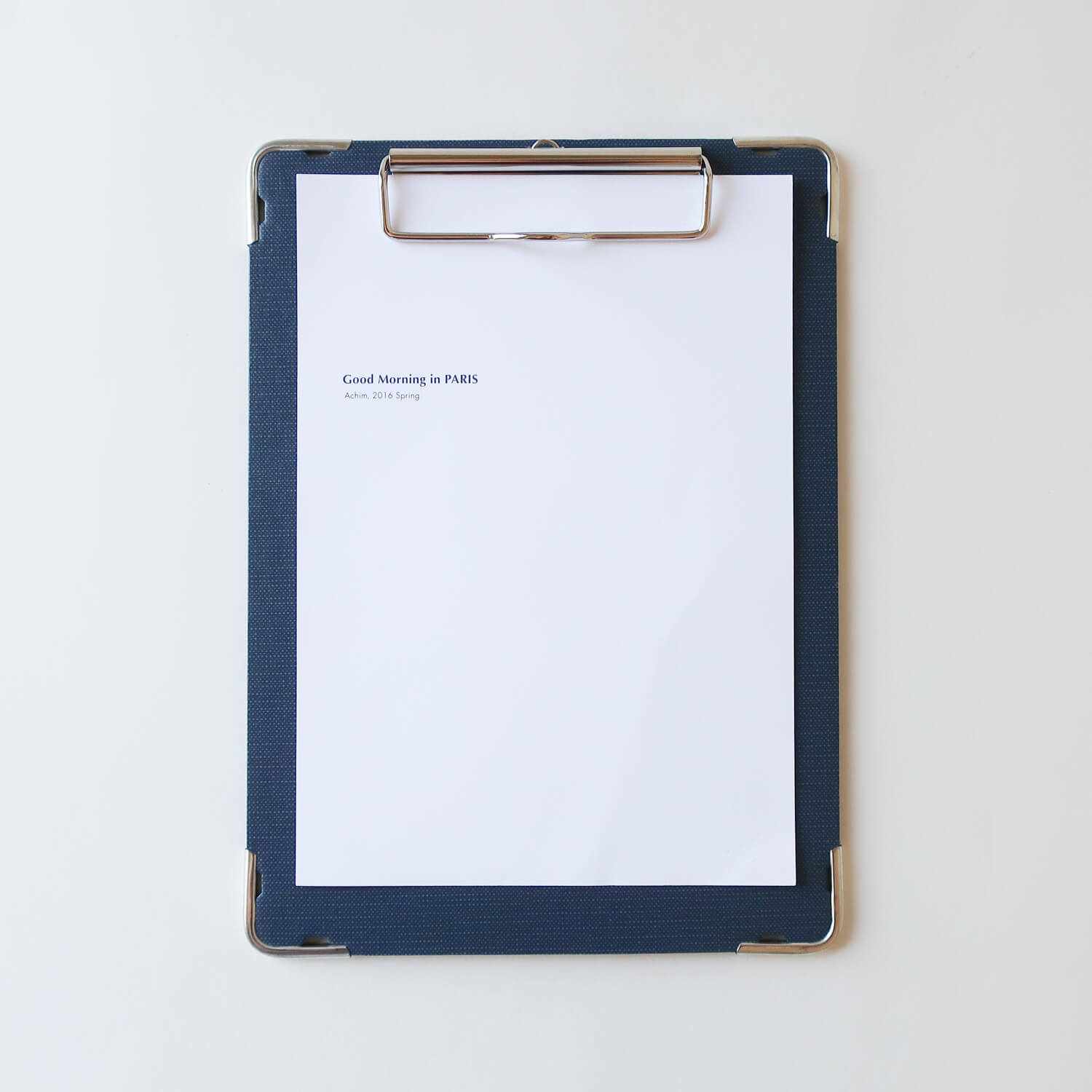 A recycled paper clipboard with paper cloth surface, in A5 vertical format by Lion Jimuki. The rounded corners are reinforced with metal, while the top metal hardware clips paper or note pads with an option to hang as a display.
