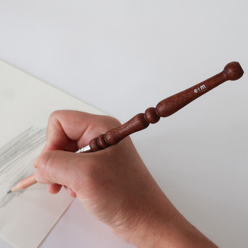 A historic design pencil extender with a stained mahogany handle and a brass holder by e+m.