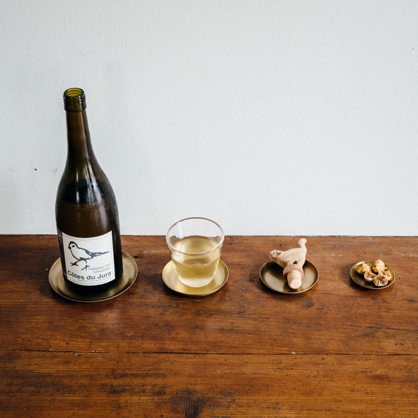 A hand-made small round plate of warmly hued brass. Perfect for placing spices while cooking, desk organization, jewelry catch-all, for your small things, and more...it's a timeless brass piece.
