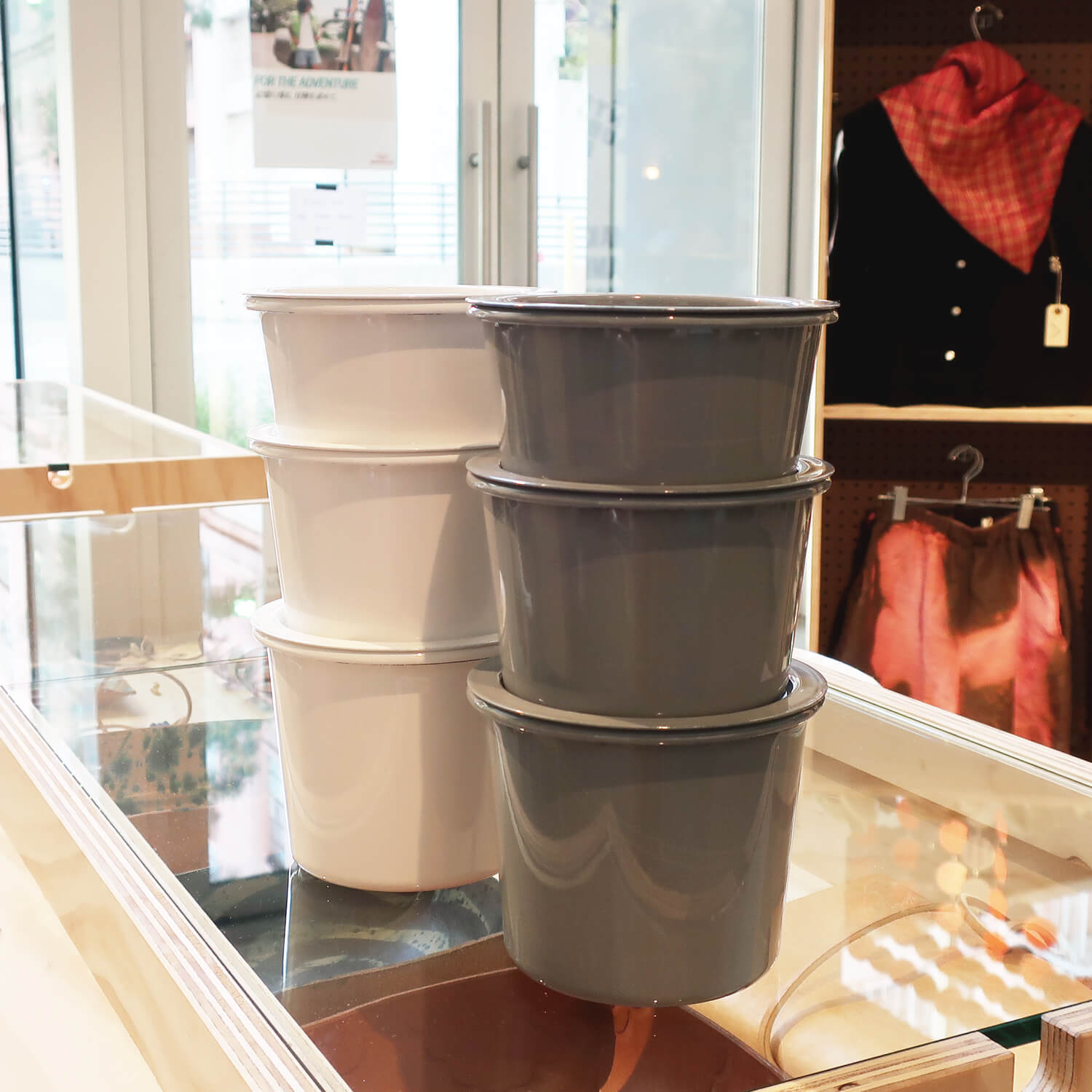 Stackable enamel canisters by kaico – all kaico products are designed by the renowned multidisciplinary designer, Makoto Koizumi.