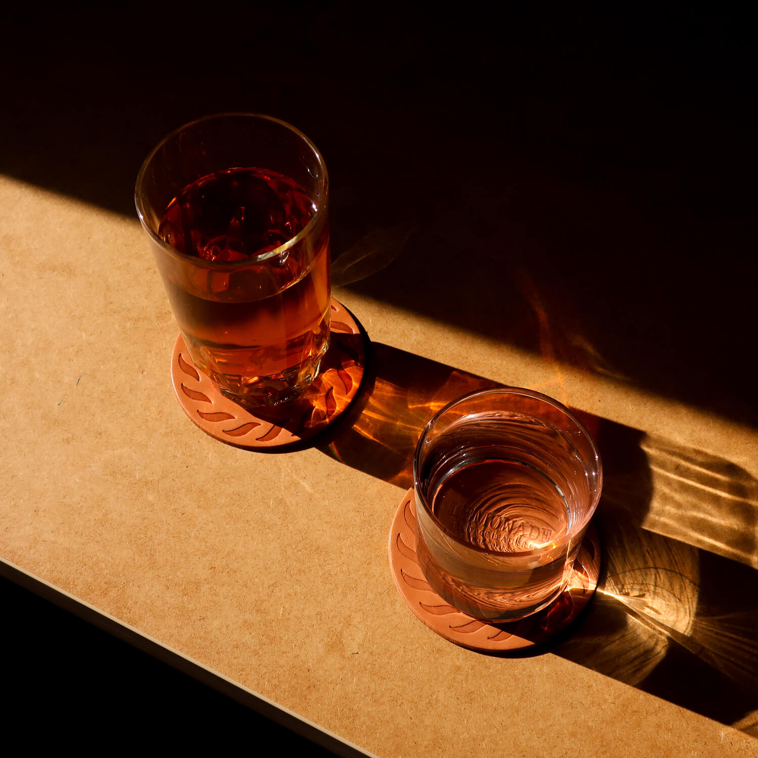 A round leather coaster with various embossed drink names by Heritage Leather.