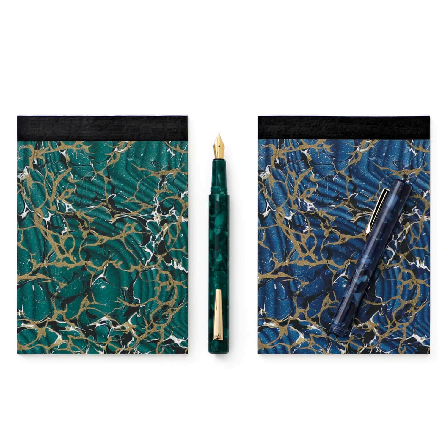 A luxurious memo pad with letterpressed grid pages encased in a marbled cover. Part of Attaché, a Hightide collection featuring marbled pattern with sophisticated gold accents.