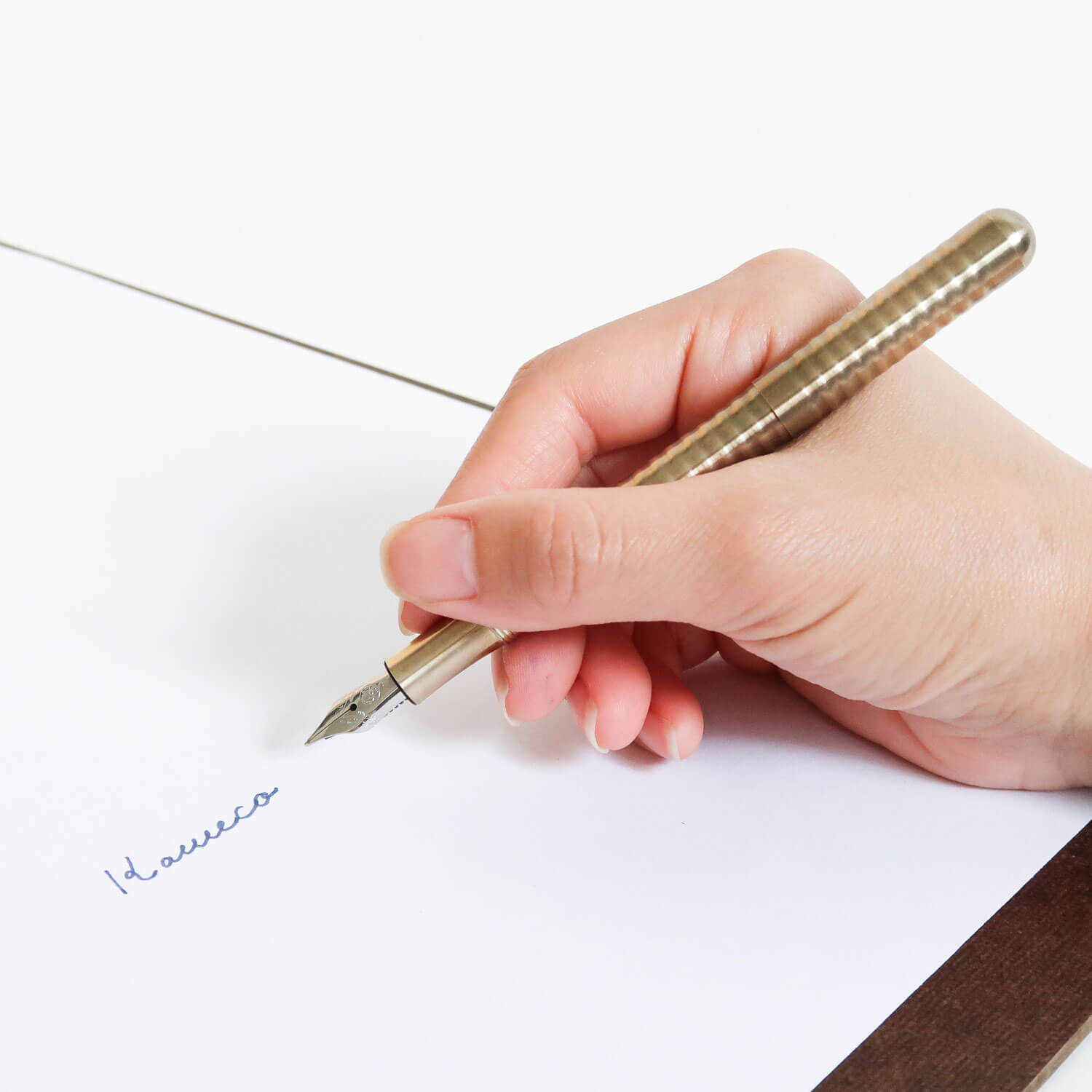 The pen is constructed of solid brass with a hefty weight despite its size. The cap screws securely onto its body when not in use, and slides into the back of the barrel to give just the right length to write with comfort. Ink flows effortlessly from its chrome-coated stainless steel nib – available in medium, fine, or extra-fine tip. The sophisticated raw brass body with an engraved wave pattern will develop a unique patina over time.