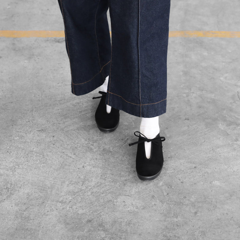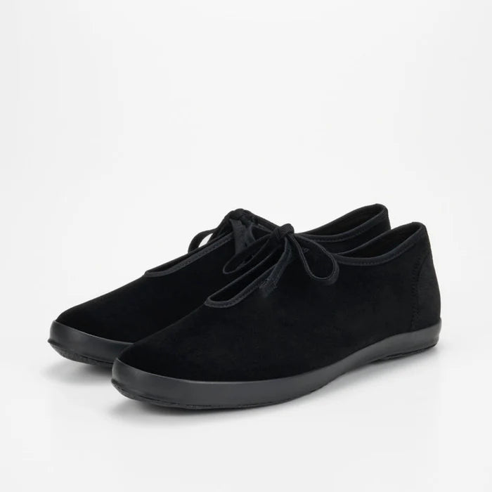 Lite Prim Velvet Shoes by Moonstar Fine Vulcanized collection. Chic and elegant, a simple pair with a one-piece velvet upper and shoelace piping.