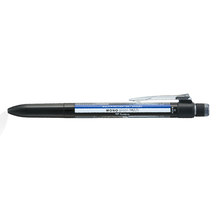 A multi-functional pen with black and red ballpoint pens, a mechanical pencil and a refillable eraser by Tombow.