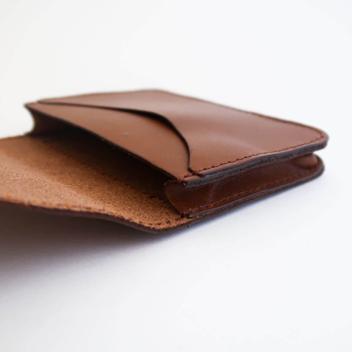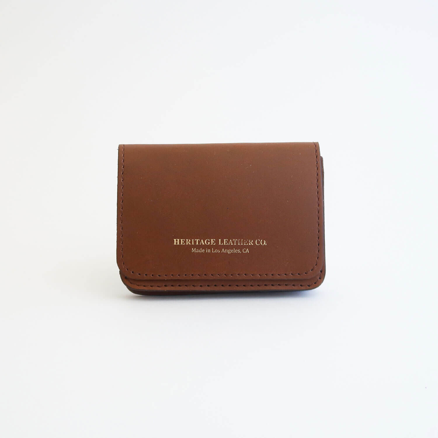 A flap-style leather wallet with card inserts by Heritage Leather Company. Made from full-grain moccasin cow leather with a gusset, a card slot on the inside as well as outside. The leather will darken and develop a beautiful patina over time.