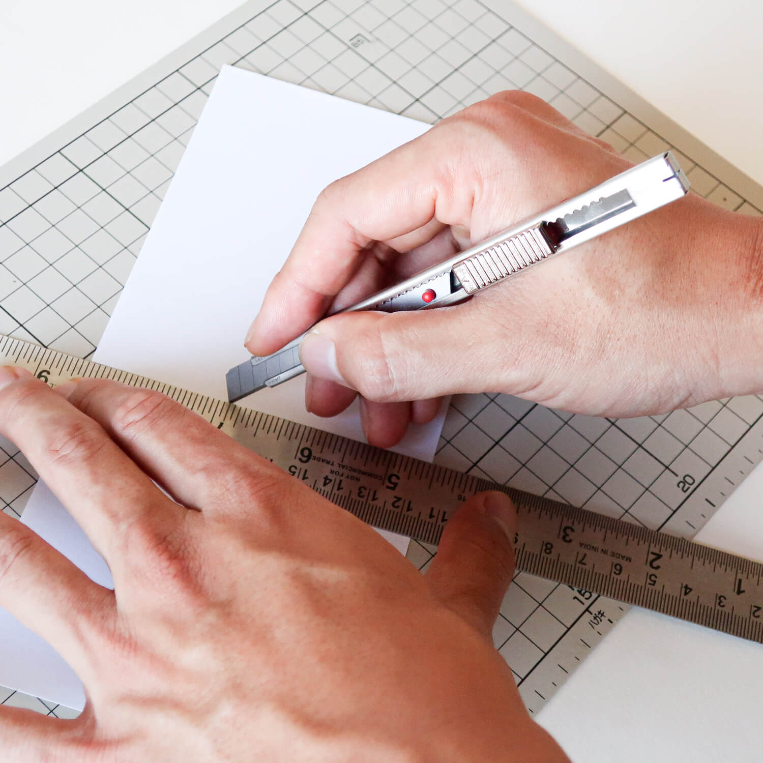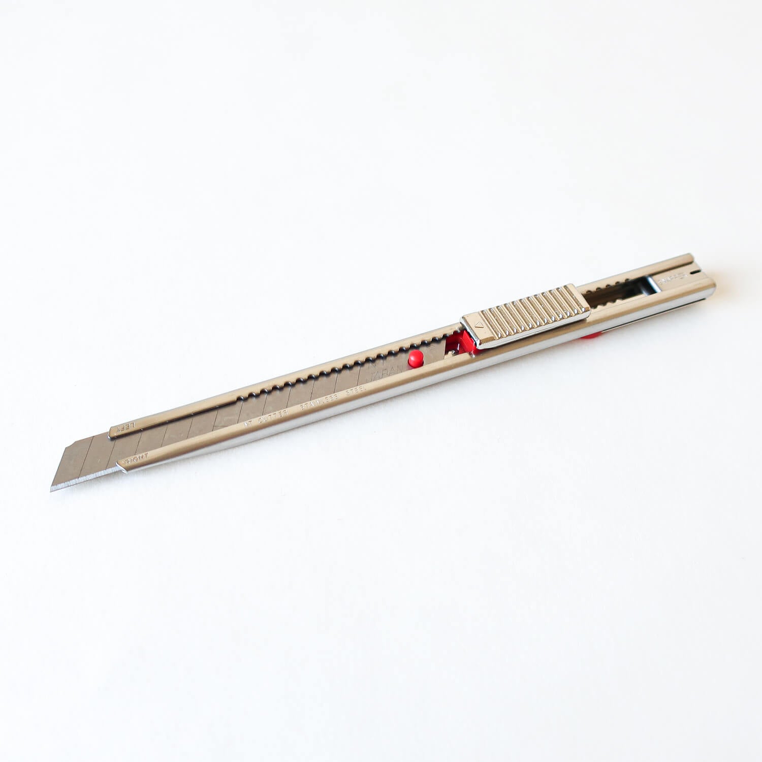 A stainless steel utility knife by NT Cutter. A snap-off blade knife is made of rust-resistant stainless steel, with automatic blade-lock function. Comes with built-in blade-snapper and pocket clip. Designed for both right- and left-handed use.