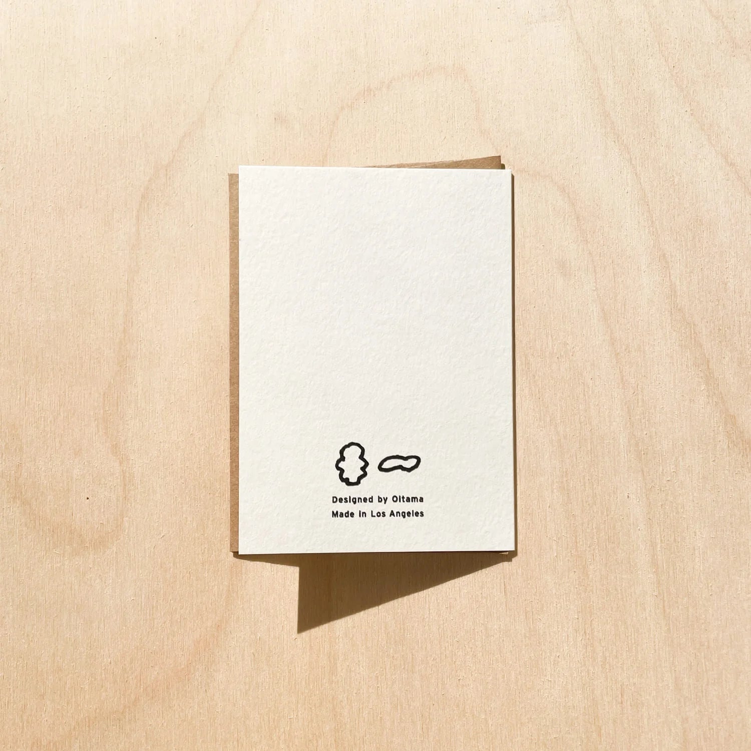A birthday greeting card with illustrations by Oitama. A folded card that is blank on the inside, accompanied by an envelope.