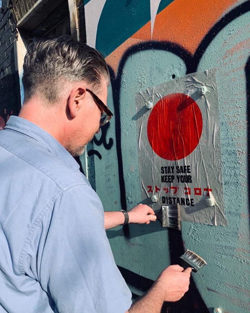 Poster reads: STAY SAFE KEEP YOUR "STOP CORONA" DISTANCE