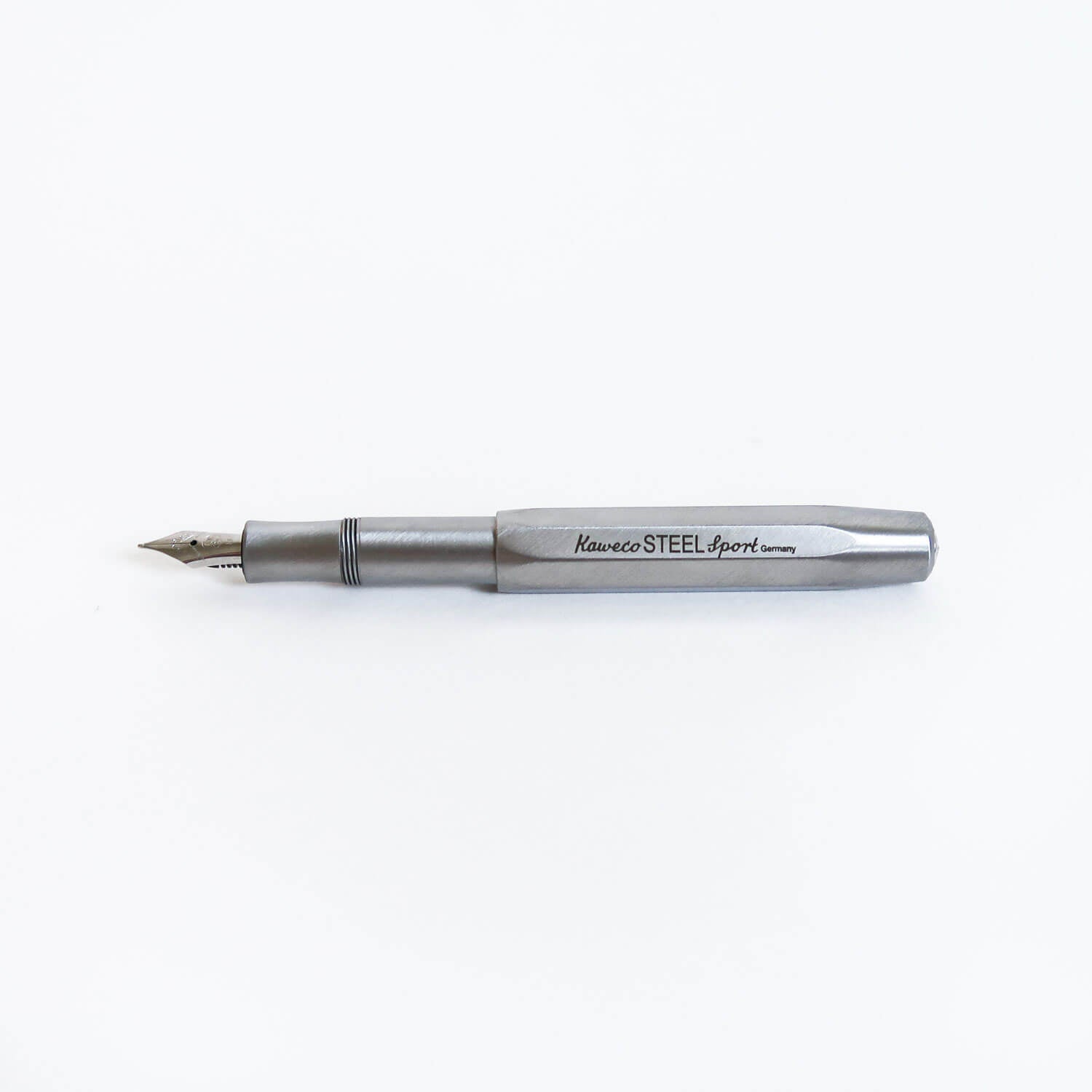 A fountain pen with a stainless steel body and a steel nib by Kaweco. The Kaweco Sport model was originally designed in 1912 for officers, sportsmen and ladies. The compact fountain pen is small enough to fit in your pocket while being just the right length and heft to hold comfortably in your hand.